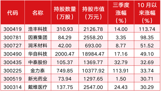 除了高毅的产品,虽然景林全球基金三季度期间对大华股份进行了19.45万股的减持,但依然保持了公司第10大股东的位置;投资精英之淡水泉证券投资信托则继续维持洁美科技第8大流通股东的位置,持股数量较二季度未出现变动。整体来看,两家机构的持股仓位均较二季度基本没有太大变化。