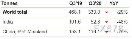 在新冠疫情的持续影响下,第三季度全球黄金需求下降到892.3吨,这是自2009年第三季度以来的最低季度总需求。年初截至第三季度末,全球黄金总需求为2972.1吨,同比下滑10%。尽管全球金饰需求较第二季度的历史低点有所提升,但持续的社会活动限制、经济放缓和强劲的黄金价格还是给不少金饰消费者带来了压力:第三季度333吨的需求比已经相对疲软的2019年同期还是减少了29%。