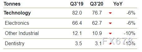 然而,值得注意的是,第三季度整体技术需求仍略有下降,该行业的技术需求下降了10%,为217.3吨。大流行造成的持续不确定性仍是未来几个月的一个主要下行风险。