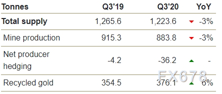 尽管黄金回收有所增长,但第三季度总供应量同比下降了3%。