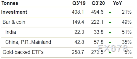 第三季度,全球黄金投资需求(包括金币和小金条的散户投资,以及流入黄金ETF的资金)达到494.6吨。这比2019年第三季度增长了21%。