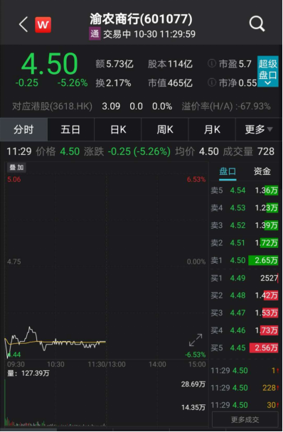 渝农商行至收盘下跌5.26%,报4.5元/股,总市值为511亿元,盘中低见4.43元/股,创上市以来股价新低。渝农商行在前一日发布三季度报告,前三季实现营业收入209.98亿元,同比增5.04%;归属于上市公司股东的净利润79.44亿元,同比降9.68%。