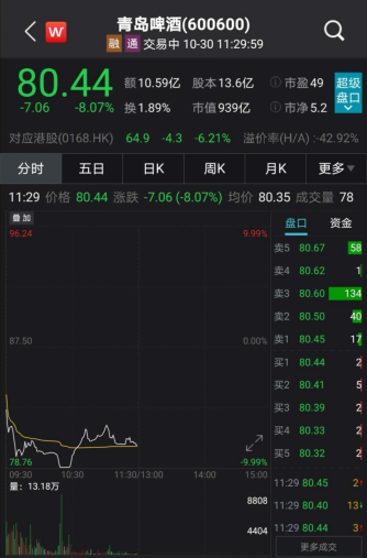 青岛啤酒盘中一度跌停,随后跌停板被打开,截至午盘跌幅收窄至8.07%,报80.44元/股。该公司前三季度实现营业收入244.22亿元,同比减少1.91%;前三季度实现净利润29.78亿元,同比增15.17%。