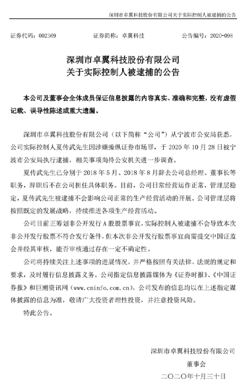 10月29日晚,卓翼科技公告称,公司从宁波市公安局获悉,公司实际控制人夏传武先生因涉嫌操纵证券市场罪,于2020年10月28日被宁波市公安局执行逮捕,相关事项尚待公安机关进一步调查。同时,公司还表示,夏传武已分别于2018年5月、2018年8月辞去公司总经理、董事长等职务,辞职后不在公司担任具体职务。目前,公司日常经营运作正常,管理层稳定,夏传武被逮捕不会影响公司正常的生产经营活动的开展。