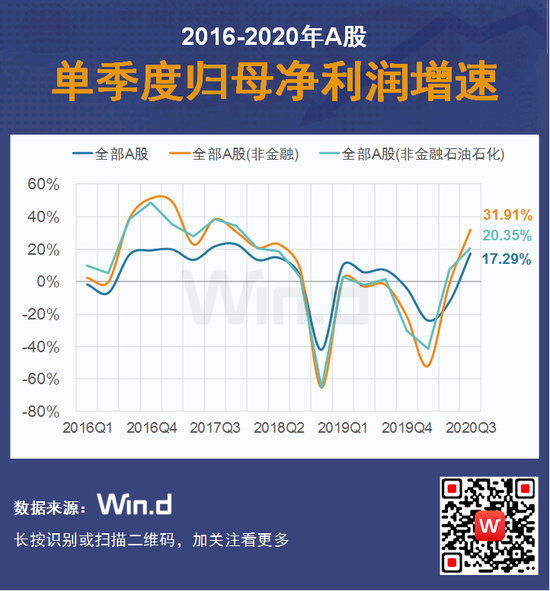 2020年第三季度,A股上市公司业绩显著复苏,整体净利润增速为17.29%(非金融31.91%/非金融石油石化20.35%),重回正增长,且明显好于第二季度的-12.76%(非金融-1.8%/非金融石油石化7.74%)。