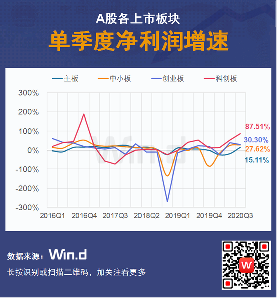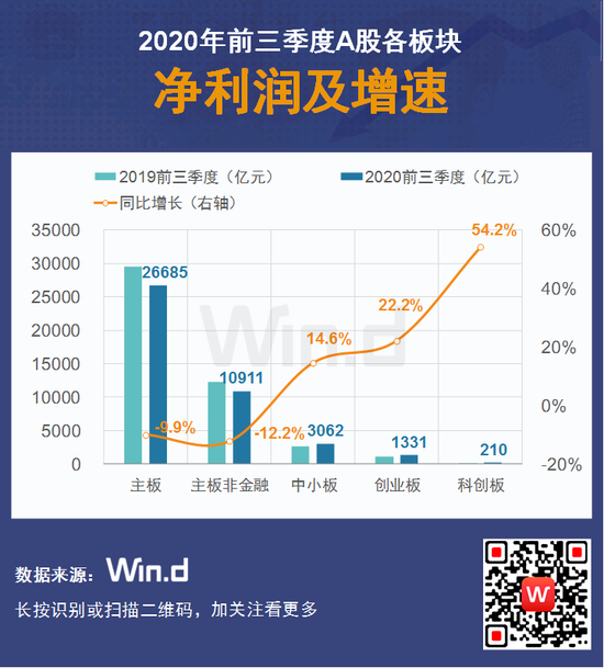 2020年前三季度,科创板归母净利合计同比增速为54.2%,远高于全部A股-6.52%的增速,亦高于中小板企业14.6%和创业板22.2%的增速。