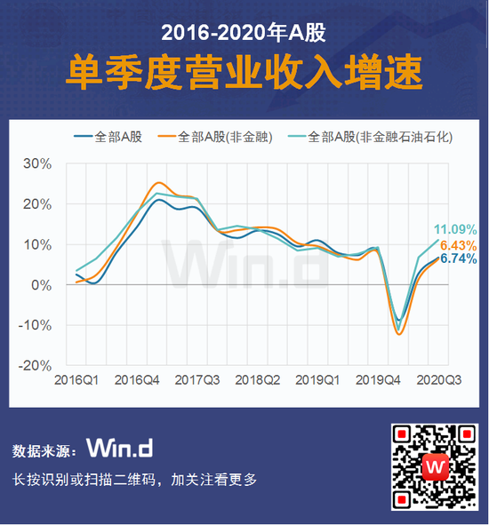 分季度看,今年以来A股整体业绩持续改善。2020年第三季度,A股上市公司营收增速为6.74%(非金融6.43%/非金融石油石化11.09%),要好于第二季度2.71%(非金融1.29%/非金融石油石化6.84%)和第一季度。
