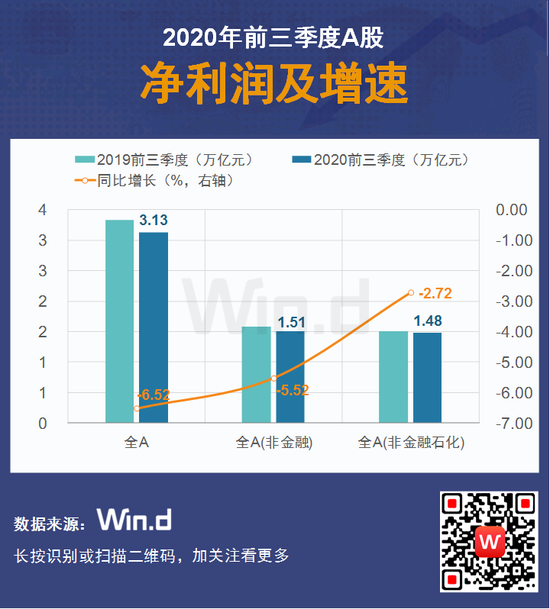 剔除金融后,2020年前三季度A股实现净利润为1.51万亿元,同比下降5.52%;剔除金融石油石化后,A股净利润为1.48万亿元,同比下降2.72%。