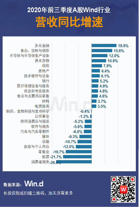 按照Wind二级行业分类,2020年前三季度营业收入呈现增长的有多元金融、食品饮料、半导体等13个行业,占比过半。