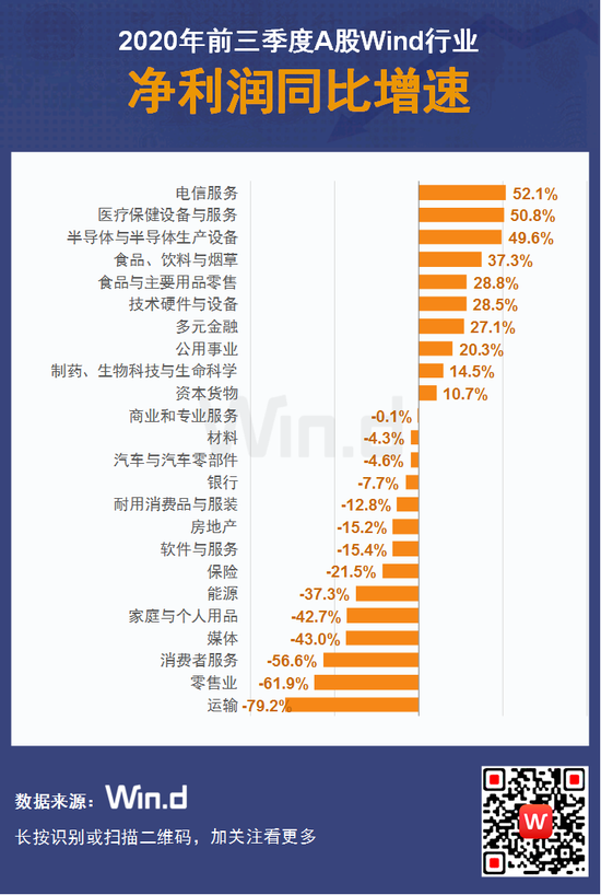 2020年前三季度,电信、医疗保健和半导体三大行业齐头并进,同比增速均在50%左右;此外,食品、技术硬件与设备、多元金融和公用事业增速均超过20%。运输、零售业和消费者服务业净利下滑最为明显。