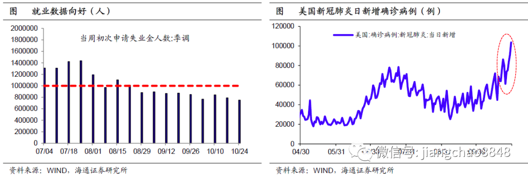 上周美国经济复苏延续。虽然9月新屋销售总数年化不及预期,批发库存初值环比意外下降0.1%,但零售库存环比明显超预期,耐用品订单环比超预期增1.9%,商品贸易帐逆差缩窄幅度好于预期,消费数据向好且未来仍有支撑。就业方面,持续向好,至10月24日当周初请失业金人数为75.1万人,已连续9周低于100万人。此外,经济增长创记录新高,美国第三季度实际GDP年化季率初值升33.1%。