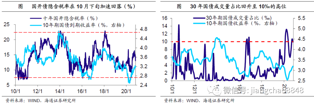 从几个情绪指标来看,虽然隔夜回购成交量占比季节性回落,但10月以来国债期货强于现货,隐含税率在10月下旬加速回落,30年国债成交量占比回升至10‰的高位,债市情绪整体有所改善。