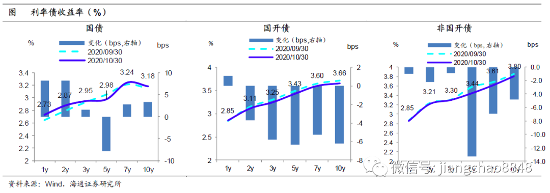 供给减少,需求尚可。10月利率债净供给为8399亿元,环比减少2294亿元;总发行量15725亿元,环比减少4402亿元。从招投标结果来看,10月最后一周国开债需求较好,农发债需求尚可。此外,存单量缩价升。