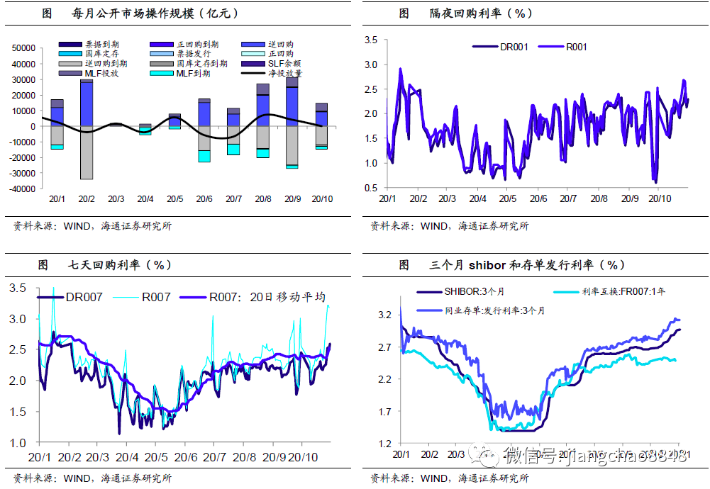 货币利率中枢整体显著抬升。从银行间质押式回购利率来看,10月R001月均值上行41BP至2.16 %;R007月均值上行18BP至2.57%;DR001月均值行36BP至2.03%;DR007月均值上行7BP至2.24%。