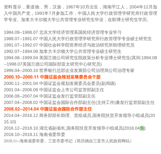 从工作简历可以看到,童道驰的公务员生涯开始于证监会,并在证监会系统一干就是14年。历任证监会规划发展委员会干部、上市公司监管部副主任,发行监管部副主任、国际合作部主任等职。