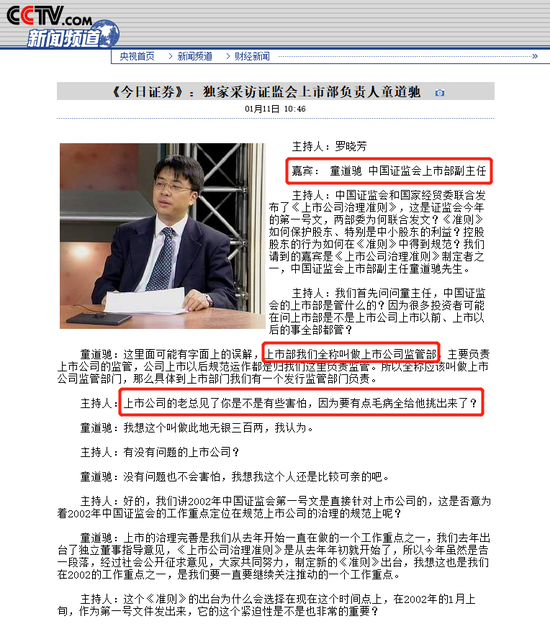 主持人:我们首先问问童主任,中国证监会的上市部是管什么的?因为很多投资者可能在问上市部是不是上市公司上市以前、上市以后的事全部都管?