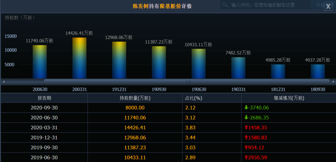 根据隆基股份定期报告显示,自2018年三季度,陈发树买入4937.28万股。当季末的持有市值约7亿元。