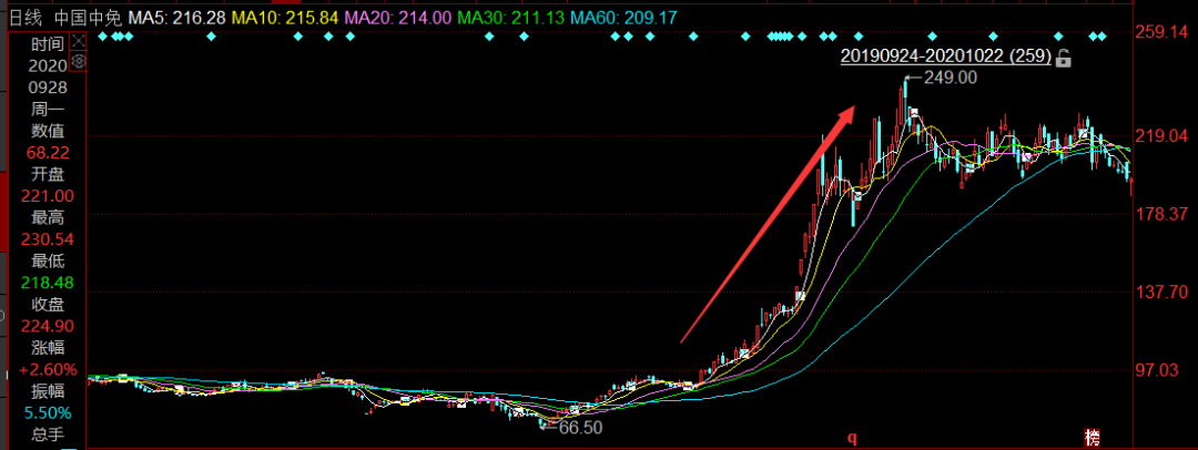 从中国中免的股价来看,陈发树的买入时点堪称精准。买入后仅仅两个月,免税政策红利迭出,中国中免成为当之无愧的龙头,不足两个半月,股价就从85元左右上涨至249元的历史新高。