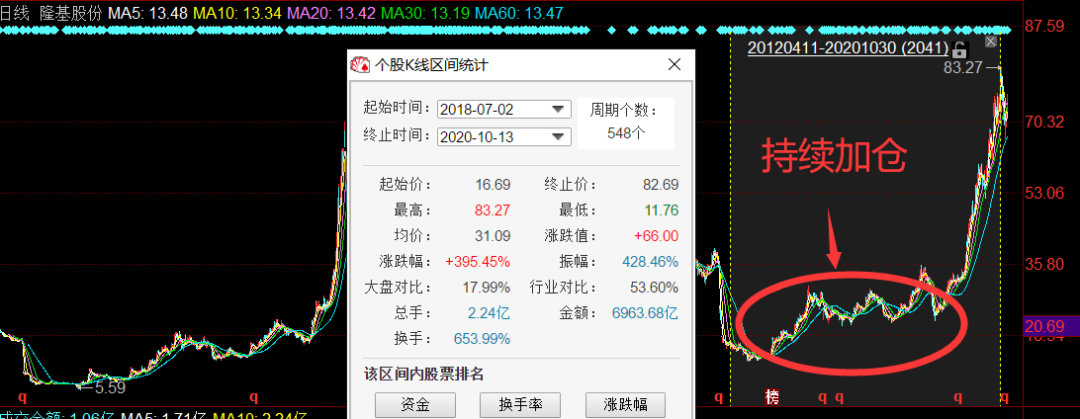 从隆基股份过去两年来的股价走势看,股价从2018年8月份的最低9.41元(前复权价),一路上涨至10月高点83.27元,涨幅近400%。