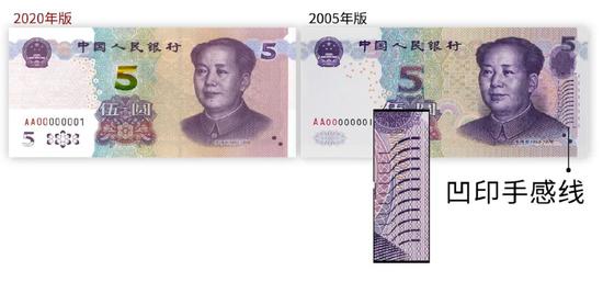2020年版第五套人民币5元纸币保持2005年版第五套人民币5元纸币规格、主图案、主色调、“中国人民银行”行名、国徽、盲文面额标记、汉语拼音行名、民族文字等要素不变,优化了票面结构层次与效果,提升了整体防伪性能。