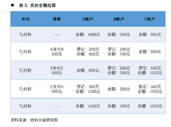 对于实时全额计算而言,我们需要对每一笔支付单独进行计算,得出清算数据,随后进入结算环节,实时进行结算,完成资金划拨,这整个流程称为实时全额结算(RTGS)。例如在T1时刻,A向B支付了200元后,我们得出“A账户余额减少200元,B账户余额增加200元,双方账户的余额在支付后分别为800元和700元”的结果,并随后进入结算环节,借记A账户200元,贷记B账户200元,完成资金划拨,在T1时刻,A查询自己的账户,会发现减少了200元,只剩下800元;剩余的T2,T3时刻也照此计算并完成结算。