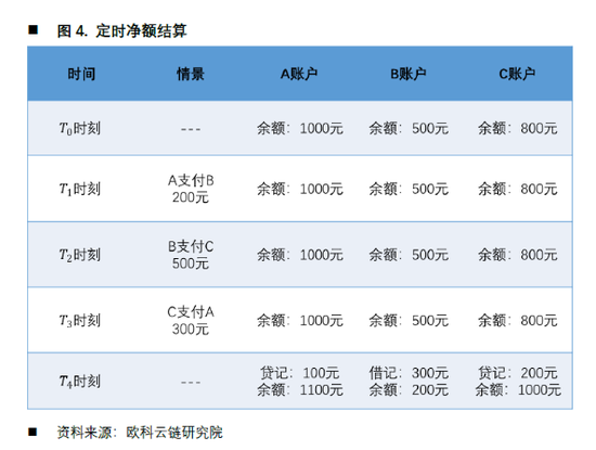 对于定时净额计算而言,我们则是在某一固定时刻,根据支付金额的轧差得到每个账户待结算的债权债务金额,随后进行资金的划拨,完成结算,这整个流程称为定时净额结算(DNS)。例如上面的例子中,如果采用定时净额计算的方式,那么在T4时刻之前的时间里,系统并不进行清算,在T4时刻时,系统会对每个账户进行轧差计算,例如对于A账户,先向B支付了200元,随后接受了C的300元,那么-200+300 =100元,即A账户增加了100元,账户余额为1100元;B账户和C账户也同理完成资金的划拨。