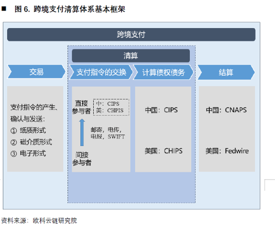 为了让大家有一个国际清算体系的大体轮廓,这里先提供一个基本框架。目前国际清算体系由两大部分组成:一是各国主导的本国货币的跨境清算系统,如美国的CHIPS(美元跨境清算系统)和我国的CIPS(人民币跨境支付系统),二是各国统一共享的国际电讯系统,如SWIFT。在实际运行中,SWIFT与各国的跨境清算系统相连,才能实现跨境支付。以美国为例,美元的跨境支付结算,需要SWIFT同CHIPS,以及美国另一支付系统Fedwire(美元大额支付系统)相连。如果银行是跨境清算系统的直接参与者,则直接通过CHIPS系统进行清算;如果银行是CHIPS的间接参与者,首先通过SWIFT向直接参与者发送指令,随后由直接参与者通过CHIPS完成清算,最终Fedwire完成结算。