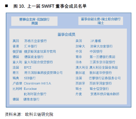 2012年3月SWIFT宣布停止对被欧美制裁的伊朗银行提供服务,让大众意识到SWIFT的重要性同时,也增加了对SWIFT过分依赖的担忧。然而,部分自媒体将SWIFT看成美国政府控制下的一个部门,这是完全错误的。事实上,SWIFT是一个非官方专业组织,其董事会由25位独立董事组成,任期三年。例如在2016年时,董事会由美国花旗银行的董事担任主席、瑞士瑞联银行的董事担任副主席,而来自中国的中国银行、香港的汇丰银行也在其中担任董事会成员。