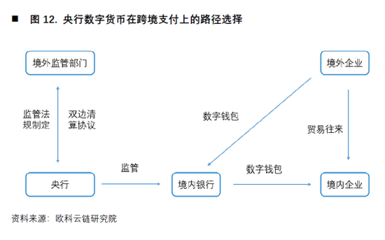 有所不同的是,在央行数字货币的语境下,没有账户的概念,而是只有数字钱包的概念。以DC/EP为例,由于DC/EP采用“双层运营体系”,因此境外企业可以注册安装由境内银行开发的央行数字货币钱包,而不需要境外银行的账户参与。当需要进行跨境支付时,由境内银行提供运营服务,直接将资金转入对方钱包,而央行负责日常监管。同时,为了防止资金通过该体系外流,可以设置额度管理。当然,在此条件下,如果境内外企业不通过SWIFT进行资金归集和集中调拨等跨境支付以及账单收取,那么将摆脱对SWIFT的依赖。