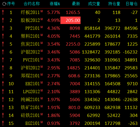 热点栏目11月2日,国内期市收盘涨跌互现,能化品分化明显,PP、塑料涨逾4%,PVC涨逾3%,20号胶跌近7%,橡胶跌近5%,原油跌近3%;黑色系上涨,焦炭涨逾3%,动力煤涨近3%,铁矿石涨近2%;有色分化,沪铝涨近3%,沪镍跌近3%;贵金属白银涨逾3%。
