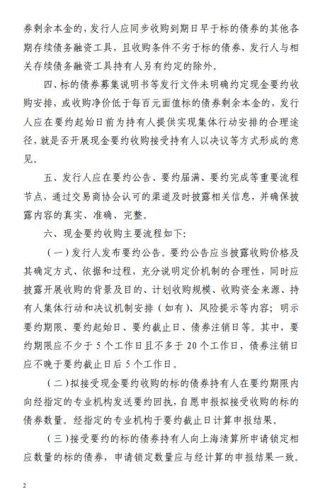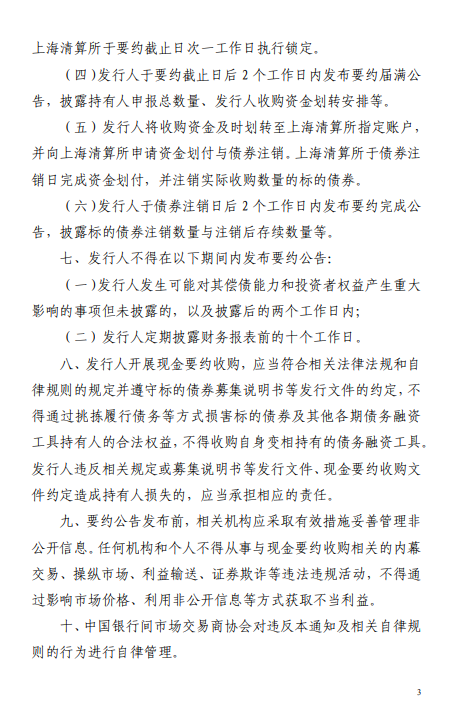 11月2日,中国银行间市场交易商协会试行非金融企业债务融资工具现金要约收购业务,明确任何机构和个人不得从事与现金要约收购相关的内幕交易、操纵市场、利益输送、证券欺诈等违法违规活动,不得通过影响市场价格、利用非公开信息等方式获取不当利益。