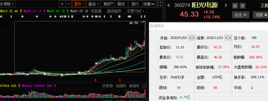 财联社11月2日讯,今日光伏板块凭借行业高景气度,再受资金追捧。光伏玻璃概念股福莱特、亚玛顿等涨逾7%,逆变器龙头阳光电源更是大涨逾16%