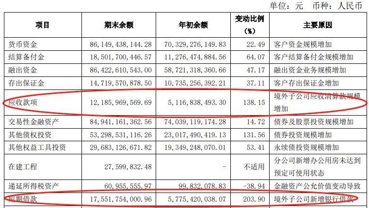 2020年1-9月,中国银河应收款项121.86亿元,较上年度末增长138.15%,主要变动原因为境外子公司应收清算款规模增加;短期借款175.52亿元,较上年度末增长203.90%,主要变动原因为境外子公司新增银行借款;应付短期融资款432.11亿元,较上年度末增长144.69%,主要变动原因为新发行短期融资券增加;应付款项111.61亿元,较上年度末增长303.49%,主要变动原因为境外子公司应付清算款增加。