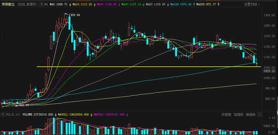 从日K线图来看,券商概念指数在7月13日创出近5年新高后,便一路展开震荡调整,并在10月底之前形成了一个旗形震荡区间。不过,10月30日的一根长阴线突破了震荡区间下沿并且失守了半年线,最终在今日创出了近4个月的新低。