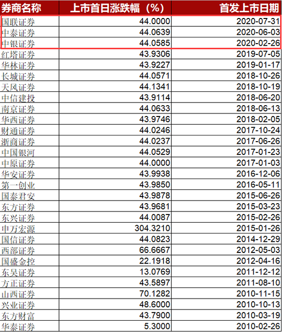事实上,券商新股上市首日涨停这一“惯例”此前在市场上已经持续了多年。据Choice数据统计,自2014年12月29日国信证券上市以来,除了重组后上市首日不受涨跌幅限制的申万宏源外,券商新股在A股上市首日即告44%“顶格”上涨的数量已达20只。