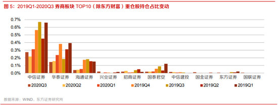 分个股来看,券商板块TOP10重仓股构成发生显著变化,兴业证券、中信建投、国金证券、东方证券、国联证券持股比例均出现不同程度增长,且进入重仓股名单的券商股数量由2020Q2的20只增至2020Q3的31只,板块的重仓持股更加分散化。
