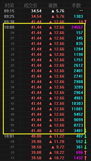 然而10点恢复交易后,短短1分钟内出现了连续的大卖单,累计成交金额4.32亿元,股价涨幅也回落到了30%左右,一直横盘震荡至收盘。截至收盘,N中金报37.70元/股,涨幅30.99%,成交49.33亿元,总市值达到1820亿元。同时,东方财富通数据显示,N中金今日主力资金净流入13亿元,位居两市所有个股首位。