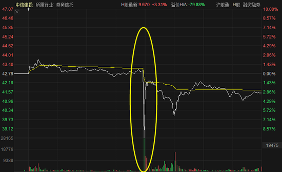 二是券商龙头中信建投,整个上午微涨红盘震荡,不过在午间即将收盘时,有近万手的大卖单杀出,瞬间将股价从上涨0.49%打压至跌停板位置,不过之后快速拉起,最终收跌3.04%。中信建投的这一波操作,一度将多只券商股股价明显下拉,有观点认为这又是一起“乌龙指”事件。