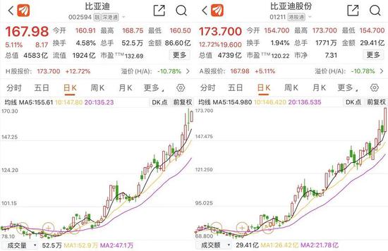 而比亚迪港股的涨幅更为惊人,昨日收盘大涨12.72%,股价达到173.7港元/股,再度刷新历史新高,年内涨幅高达347.87%,比亚迪走势之强劲显然超出了市场预期。