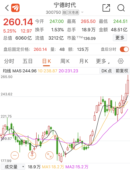 此外,动力电池龙头宁德时代2日股价也创下历史新高,股价达到260.14元,市值突破6000亿大关,这也是创业板首次出现市值超过6000亿元的公司。
