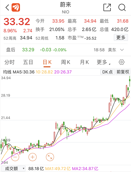 蔚来汽车10月交付5055台,创月度新高,连续第8个月实现同比增长。年初一度陷入破产边缘的蔚来今年以来股价大涨728.86%,截至周一美股收盘,蔚来汽车涨8.96%,市值为420亿美元,盘中更是一度超过上汽集团。