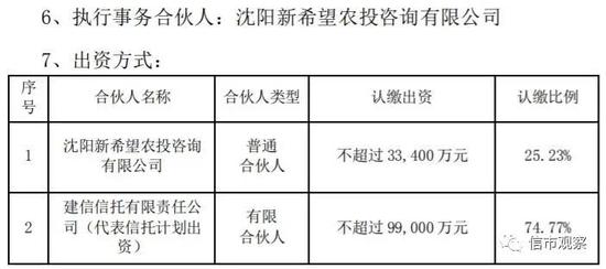 其中沈阳新希望农投认缴出资金额不超过 33,400 万元,出资比例为 25.23%;建信信托(代表信托计划出资)认缴出资金额为不超过 99,000 万元,出资比例为 74.77%。