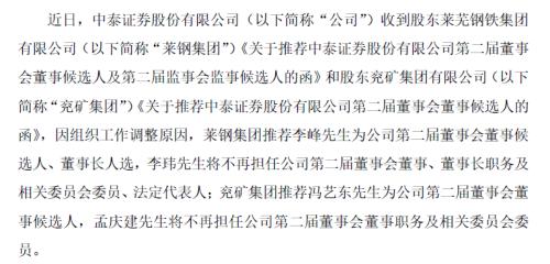 10月30日,中泰证券公告,李峰正式任职公司董事后担任公司第二届董事会董事长并根据《公司章程》规定担任公司法定代表人。