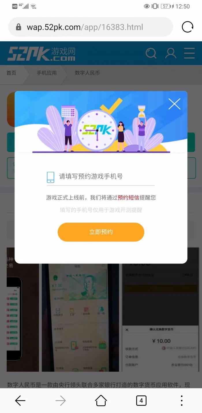 记者在52PK游戏网和游戏369网站的数字人民币下载入口看到,页面显示的是游戏预约。前者需要填写预约手机号(仅用于游戏开测提醒),后者除手机号之外还需要关注公众号。