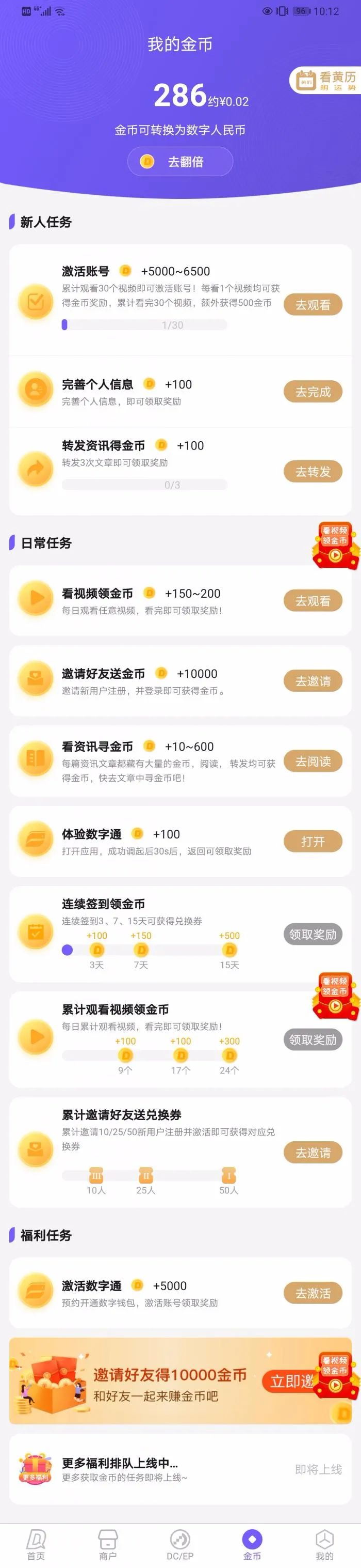 记者点开视频任务,观看了一快手的下载广告后,获得了186金币,约为0.01数字人民币。至于它推广中所提及的预约数字人民币,需要下载另一款“数字通”APP,而实际上也是与D讯类似的做任务领奖励的广告软件。