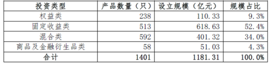 图为证券期货经营机构资管产品月度备案数量及规模趋势从投资类型看,9月备案私募资管产品数量最多的是混合类,备案产品设立规模最大的是固定收益类,设立规模为618.63亿元,占比52.4%。商品及金融衍生品类设立规模为51.03亿元,占比仅4.3%。