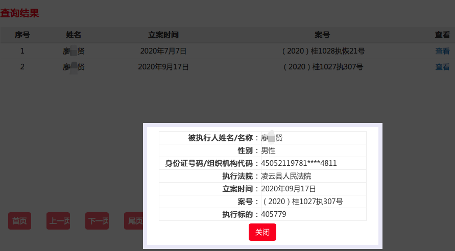 红星新闻通过最高人民法院开通运营的中国执行信息公开网查询发现,廖某贤确被广西北海、百色等各地法院列为失信被执行人,自2013年至今约有十条。