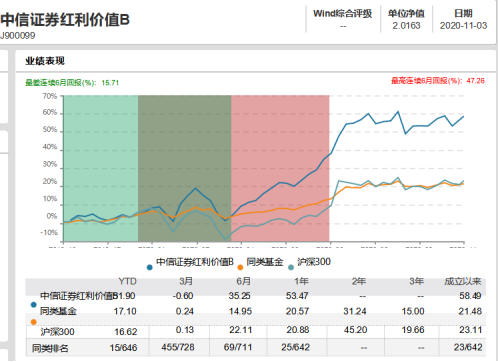 按照中信证券红利价值的产品设计,11月4日,该产品一年锁定期将满,会陆续向持有人开放赎回。Wind数据显示,自成立以来,中信证券红利价值B的业绩回报为58.49%,同时期内,同类基金的业绩表现平均为21.48%,沪深300的涨幅为23.11%。Wind统计显示,至11月3日,中信证券红利价值过去一年的业绩回报排名位居同类产品25/642,即3.89%分位。
