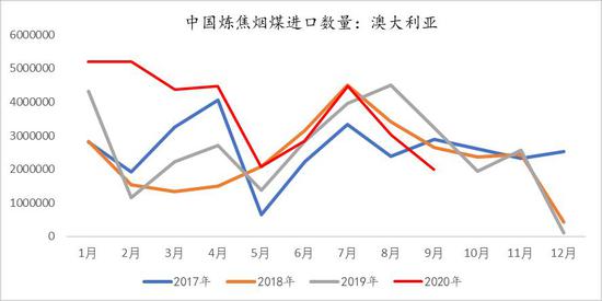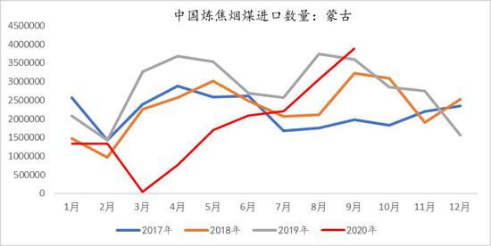 1-9月,中国从澳洲、蒙古分别进口炼焦煤3359.24万吨、1646.75万吨,累计同比分别为+27.63%,-38.07%。考虑到澳煤通关趋严,若全年进口增速按20%测算,蒙煤后续几月持平于去年同期,则全年蒙煤进口量同比仍下降30%,澳蒙全年进口增速预计下降6.08%,也即意味着在焦炭产量同比为正增长下,焦煤进口量方面呈现出负增长。从季节性走势,不难看出,11-12月进口量是呈明显下降态势。