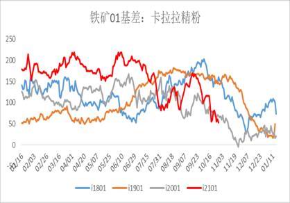 据测算,目前最便宜可交割品为卡拉拉精粉,从铁矿01基差走势来看,目前基差已回落至往年同期较低水平。